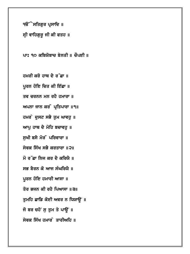 Chaupai Sahib Patshai Dasvi Kabio Vach Bainti Chaupai hamri kro hath dai rchcha. pooran hoeh chit ki eichcha. tav charnan mun rehai hmara. apna jan kro pritipara. (1) hamrai dust sabhai tum ghao aapu hath dai moeh bachavo; sukhi basaimoro privara saivak sikh sbhai kartara. (2) mo rchcha nij kr dai kriye. sabh bairn ko aij sunghriye. pooran hoeh.