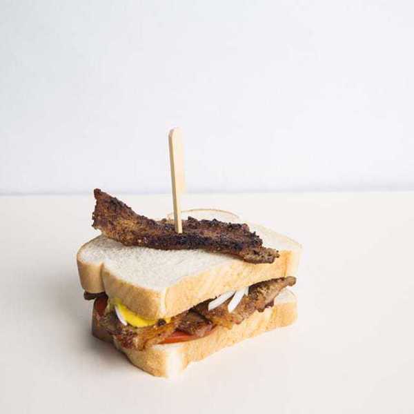Ingrédients. 6 tranches de flanc de porc frais. 15 ml / 1 c. à table d'épices à grillades de Valleyfield. 4 tranches de pain blanc. 10 ml / 2 c. à thé de moutarde douce jaune. 1 petit oignon jaune émincé. 1 tomate rouge coupée en tranches.