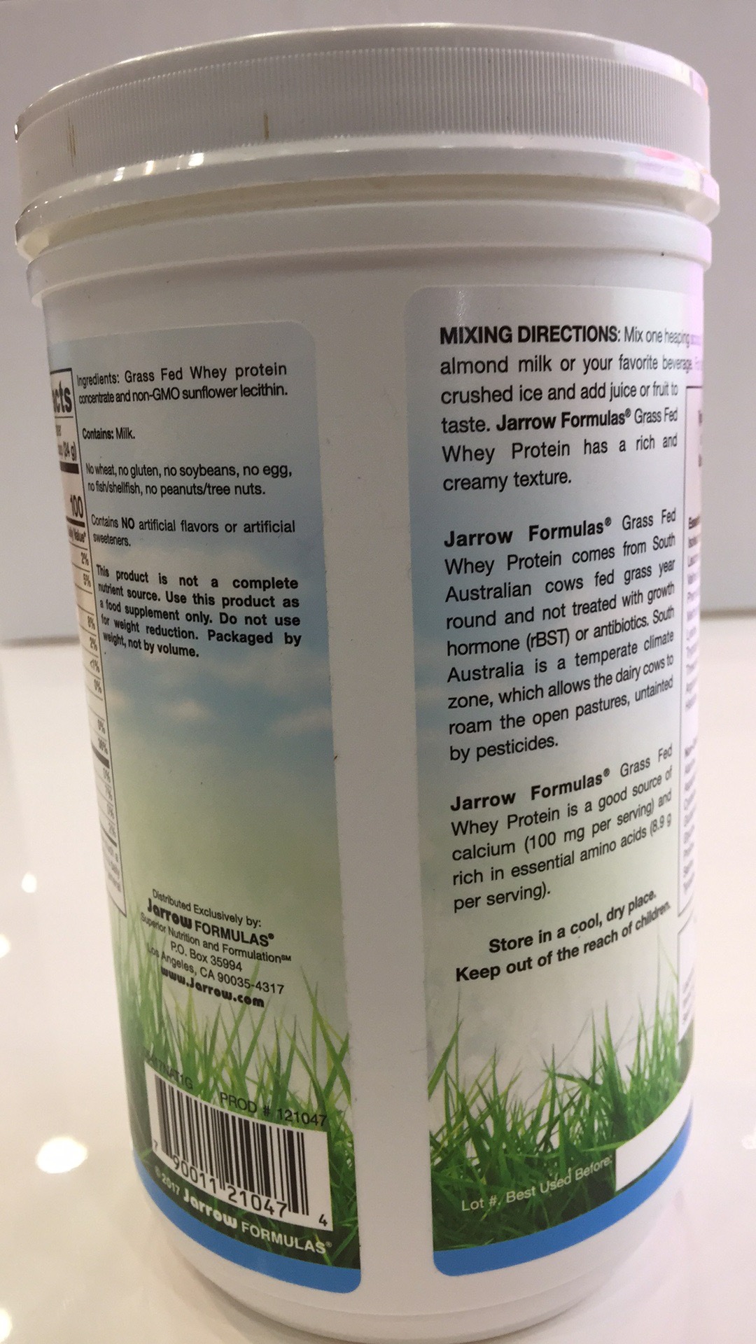 Non-Denatured & Cold Processed. rBST & rGBH Free. Source of Calcium. 23 grams of Protein per serving. 5 grams of BCAA per serving. Ingredients: Grass-Fed Whey Protein Concentrate, Non-GMO Sunflower Lecithin. Directions: Mix 30 grams of unflavoured Plain Whey protein powder in 8-12 oz of water, almond milk, or blend in your favourite smoothie.