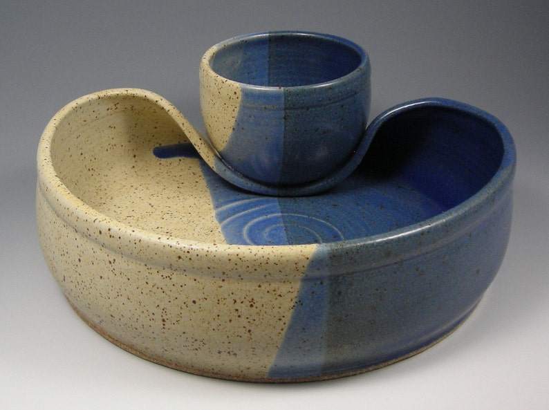 This Chip and Dip serving platter is handmade on the potter's wheel, and is perfect for entertaining your guests! Can be used with chips, fruits/veggies, crackers, etc and dips like chip dip, salsa, nacho cheese, olives, guacamole.. . Dimensions: 11.5in/30cm wide, interior 4.5in/12cm (all sizes subject to variations due to the handmade.