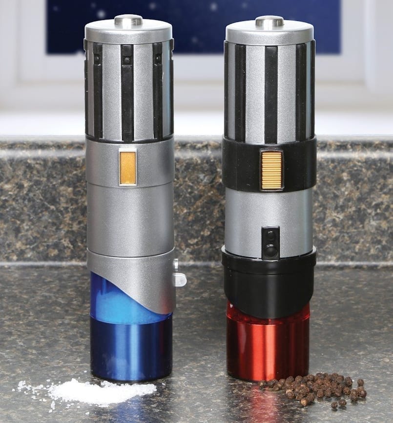Product Description. Star Wars Lightsaber Electric Salt and Pepper Shakers- Best Salt and Pepper Grinders In The Universe. Everyone, from denizens of the Death Star to the irregular regulars at the Mos Eisley cantina, appreciates a little extra flavor. The Lightsaber salt and pepper mills are great tools no matter where your travels take you.